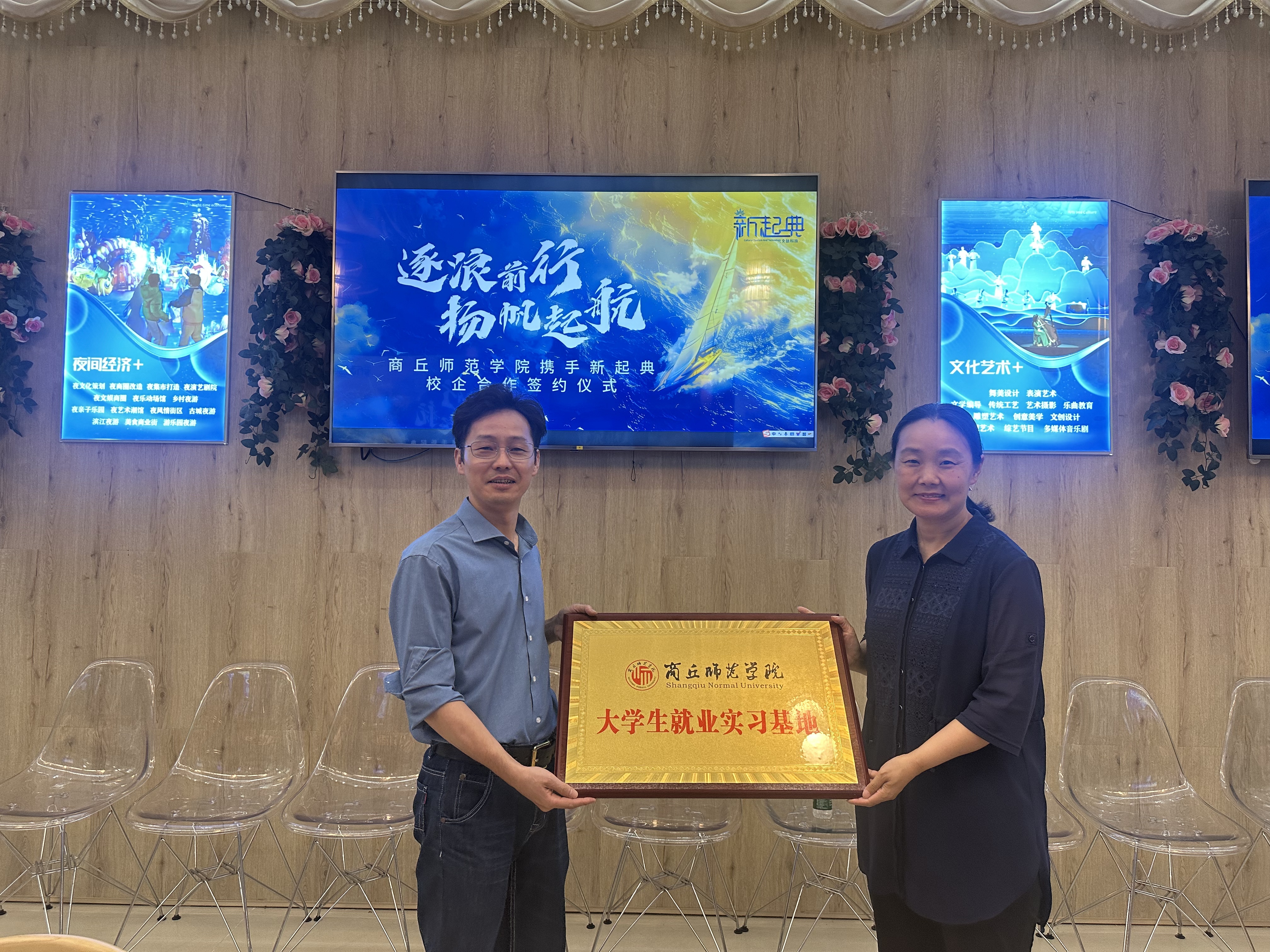 座谈会上,刘振宏介绍了广州新起典文旅科技有限公司在多媒体声光电等领域深耕10年,拥有80多项知识产权实施完成近200余项经典项目,成功开拓出多媒体声光电的多元化应用的演艺+模式。王晓征介绍了公司历史沿革、学科特色、人才培养及毕业生就业等情况。双方就进一步合作深入探讨,相互交流,并签署了《太阳成集团tyc122cc老员工就业实习基地协议书》。王晓征向广州新起典文旅科技有限公司授“太阳成集团tyc122cc就业实习基地”牌,为下一步校企之间的紧密合作奠定坚实基础。