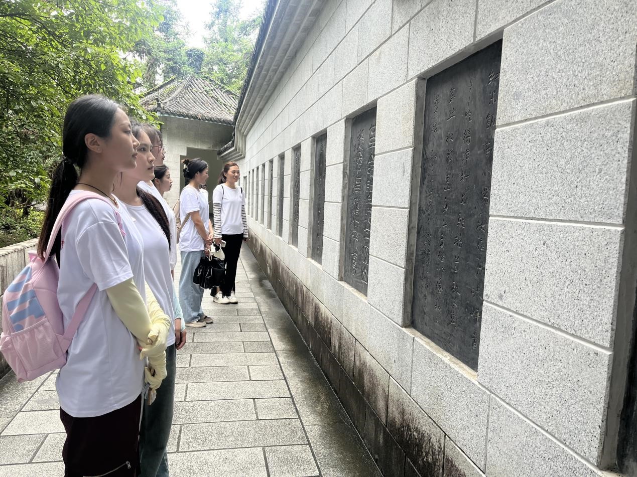 穿过纪念堂,行至山腰,便是井冈山雕塑园。青松翠柏间耸立着毛泽东、朱德、袁文才等革命先辈的19尊雕像。漫步于雕塑园内,实践团成员不仅瞻仰到各大伟人的英姿,也从雕塑底部的讲解中了解回顾他们的事迹。走过雕像园,爬上山顶,瞻仰井冈山革命烈士纪念碑,其分为础座、碑座和主碑三个层次。第一层是大厅,南眺市区全貌,北瞻纪念碑主体雄姿。二层设有展室,三层为主碑。自纪念碑下山,途经山路即为碑林。碑林由碑亭、碑廊、自然碑型等部分组成,因势而构,曲折回环,沿山路始末,百余块石碑皆出自大师之手。实践团成员们在此处拜读,或诗歌,或骈文,或对联,从文字、雕刻手法中感受井冈山的红色文化、感受后来者对井冈精神的情感,深入理解井冈精神的内涵。