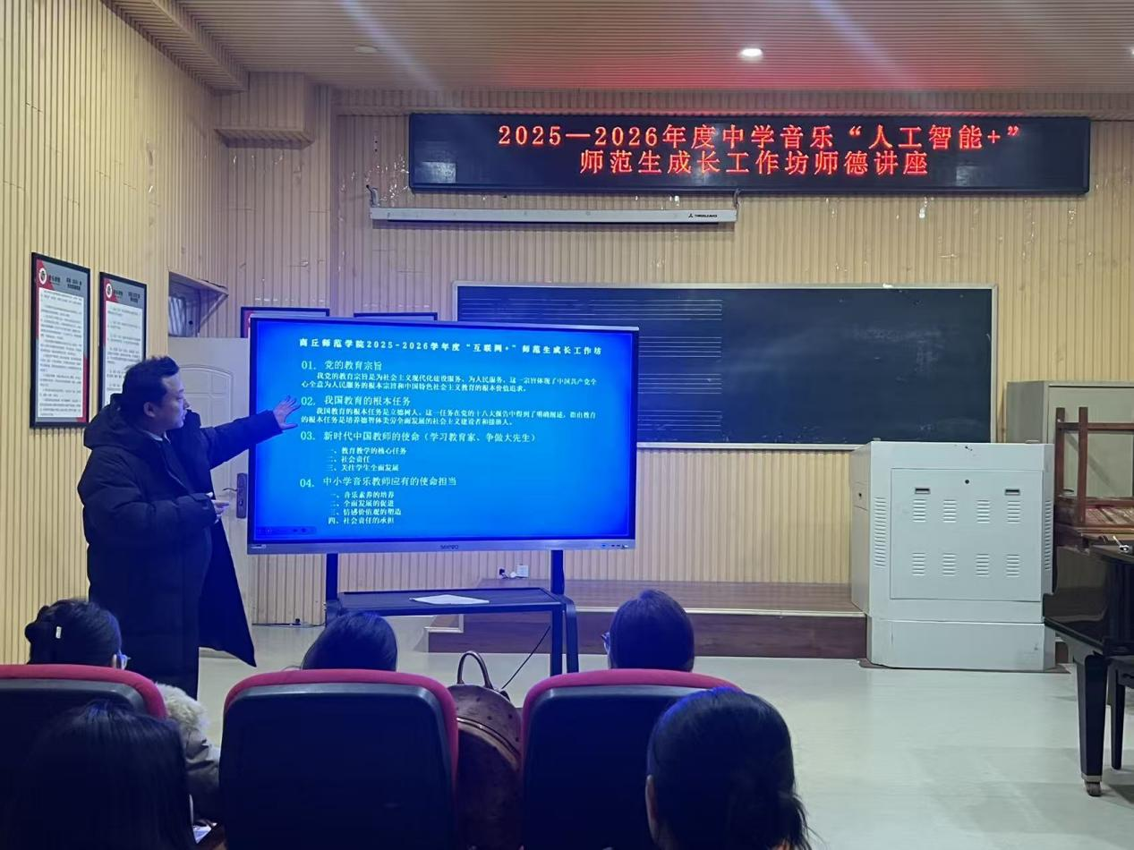 2025年12月26日,太阳成集团tyc122cc中学音乐“人工智能+”师范生成长工作坊师德讲座如期举行。工作坊坊主周运健老师以“不忘初心、以美育人——做新时代‘四有’好老师”为核心主题,结合教育实践经验、时代发展要求与本土榜样力量,为在场师范生带来了一场兼具思想引领与实践指导的精神盛宴,助力未来音乐教育工作者筑牢师德根基、明晰职业方向。