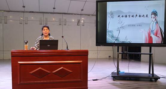 张艳红通过剧目展示,详细讲解了不同剧种戏曲语言的独特魅力,普及了必要的戏曲知识,呈现了我国戏曲在不同历史时期中的美学特征。对戏曲在文学、音乐、表演、美术等多方面特有的程式和规范进行了深入剖析,对戏曲中各个角色、行当的语言进行分类,对戏曲语言的声韵之美进行了深层次的审美鉴赏。把戏曲语言在自我介绍、说明剧情、展示冲突和刻画人物形象等方面的重要作用进行系统展示,并与现场的师生充分互动,让观众切身感受戏曲语言的优美韵味,增强对传统文化的兴趣和自信。
