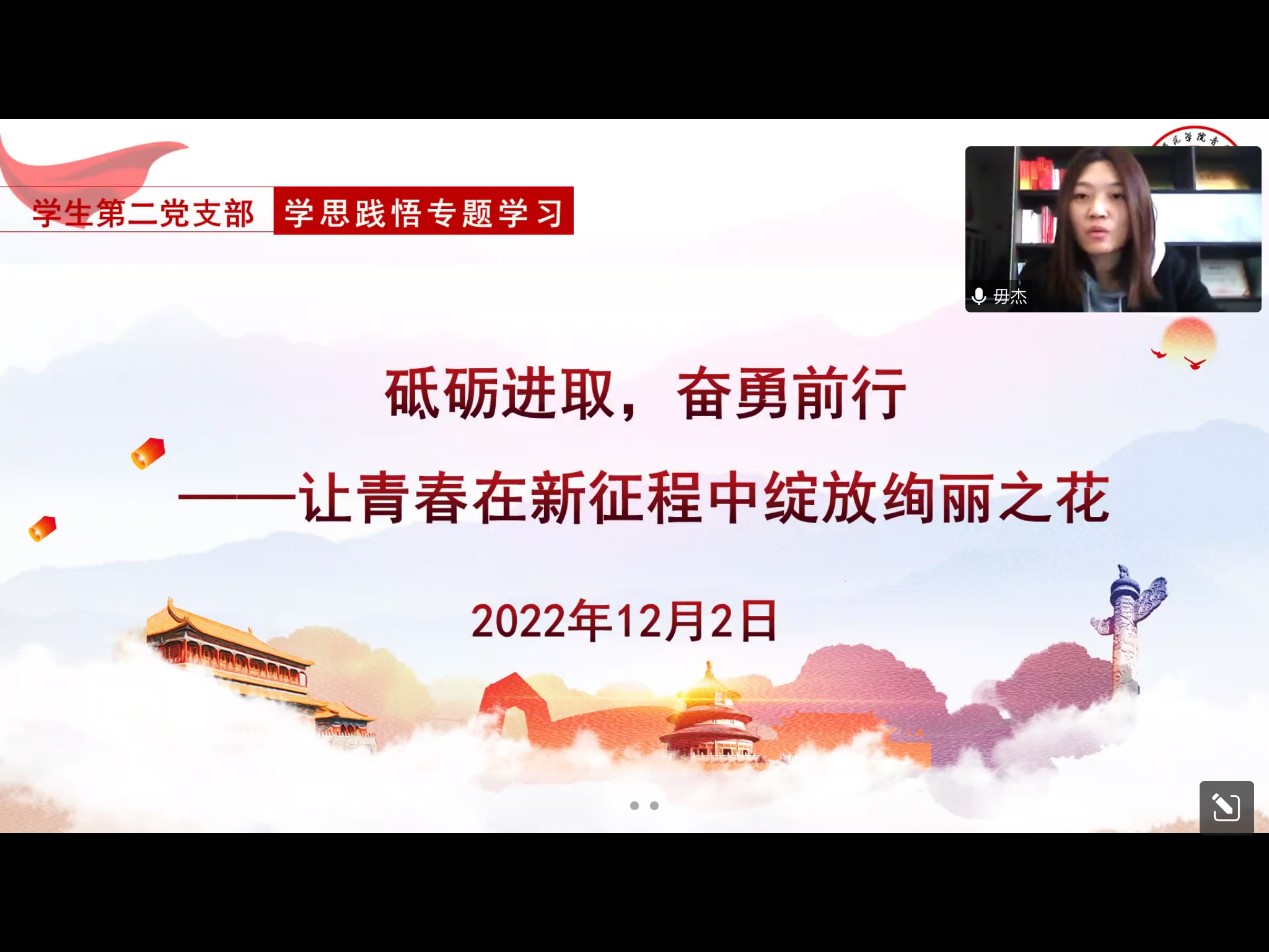 为全面学习贯彻落实党的二十大精神,切实把青年党员的思想和行动统一到党的二十大精神上来,122日,太阳成集团tyc122cc员工第二党支部书记毋杰同志以《砥砺进取,奋勇前行——让青春在新征程中绽放绚丽之花》为题宣讲党的二十大精神。支部全体党员参加。