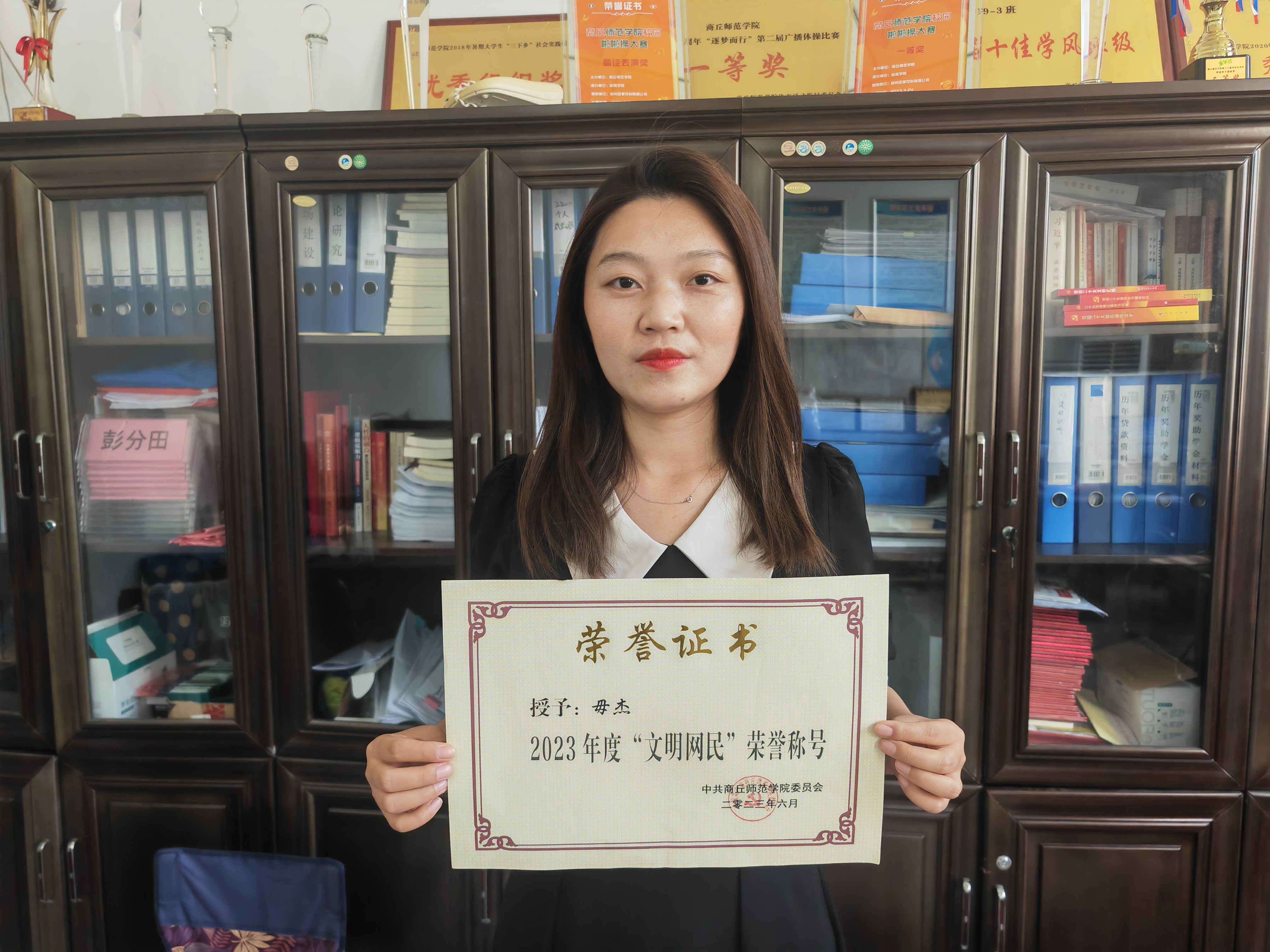 蒋修辉、王豫立、刘建坤、周加海、成丹、马冬莉等教师荣获“文明教师”荣誉称号,毋杰荣获“文明好网民”荣誉称号。