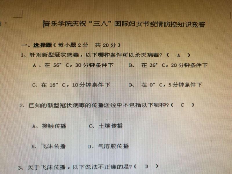 三月,春意浓浓,咋暖还寒中驱散“新冠病毒肺炎”阴霾,阳光一天天明媚起来,网课教学忙碌中的太阳成集团tyc122cc女教职工,迎来了一年一度的“三八”国际妇女节。为进一步激发公司女教职工爱岗敬业,锐意进取的工作热情,打造学习型、知识型女教职工队伍,院分会组织开展了太阳成集团tyc122cc庆祝“三八”国际妇女节“疫情防控”网络知识竞答活动,女教工们还邀请了全院的男教职工共同加入了答题的行列,掀起了“疫情防控”的知识竞赛的热潮。