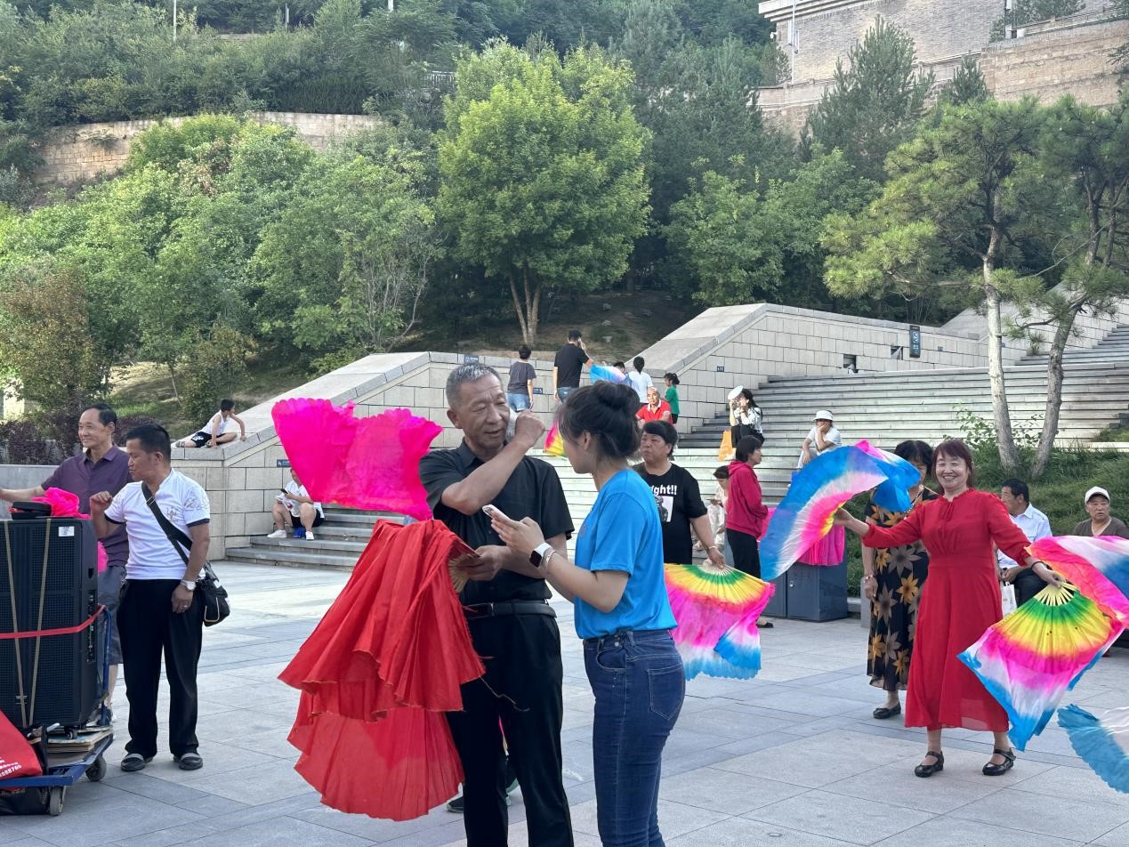 一方面,实践团成员们在鲁迅艺术文公司旧址与延安文艺纪念馆多角度、多维度搜集延安地方红色歌曲相关材料,深入体会学习延安文艺精神,了解了延安文艺运动的历史背景、理论体系及其涌现出的优秀作品,为课题报告的完成奠定了扎实的理论基础。另一方面,前往延安大剧院开展学习调研与专业建设交流,先后参观剧院场馆及重要设施,详细了解了剧院的日常演出节目情况及演出项目的运作流程等。同时进入社区观摩学习传统秧歌技法,提高陕北秧歌表演能力;采访延安市千人秧歌协会会长高怀东,了解延安地方特色红色文化资源,收集相关的实践材料,推动实践团课题研究走向新高度。