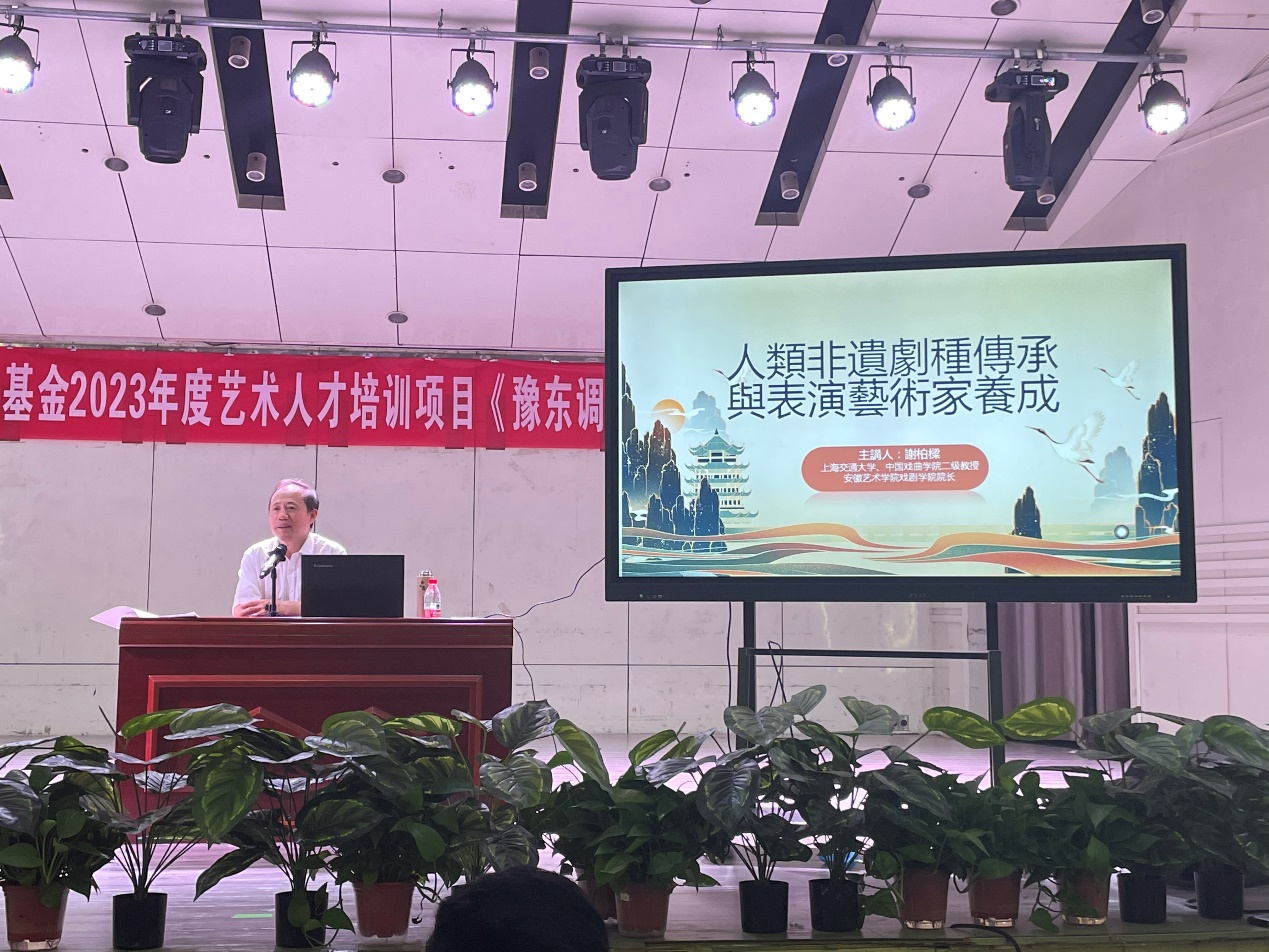 6月27日上午,中国戏曲公司、上海交通大学教授、安徽艺术公司戏剧公司经理谢柏梁在太阳成集团tyc122cc艺术厅为国家艺术基金2023年度艺术人才培训项目《豫东调唱腔传承与人才培养》学员们授课,题为《中国戏曲史论》和《演员的自我修养与艺术品格》,太阳成集团tyc122cc王艳梅副经理主持。