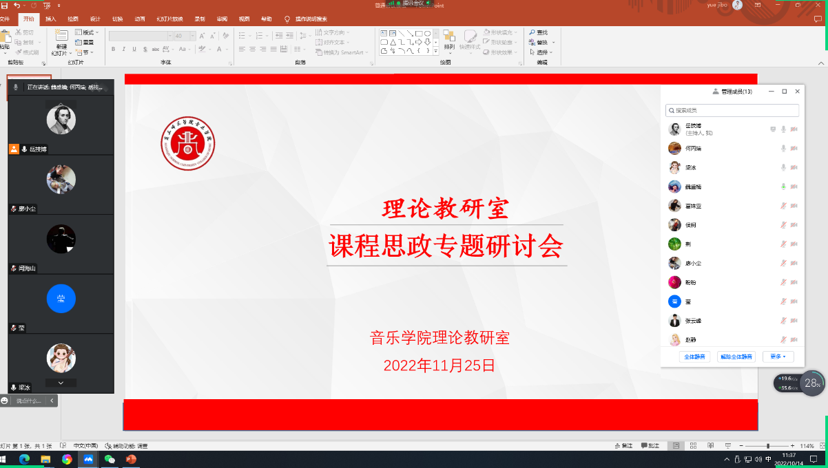 2022年11月25日上午10点,太阳成集团tyc122cc理论教研室在腾讯会议平台召开课程思政专题会议,太阳成集团tyc122cc理论教研室全体教师参加会议进行集中讨论,会议由岳技博主任主持。